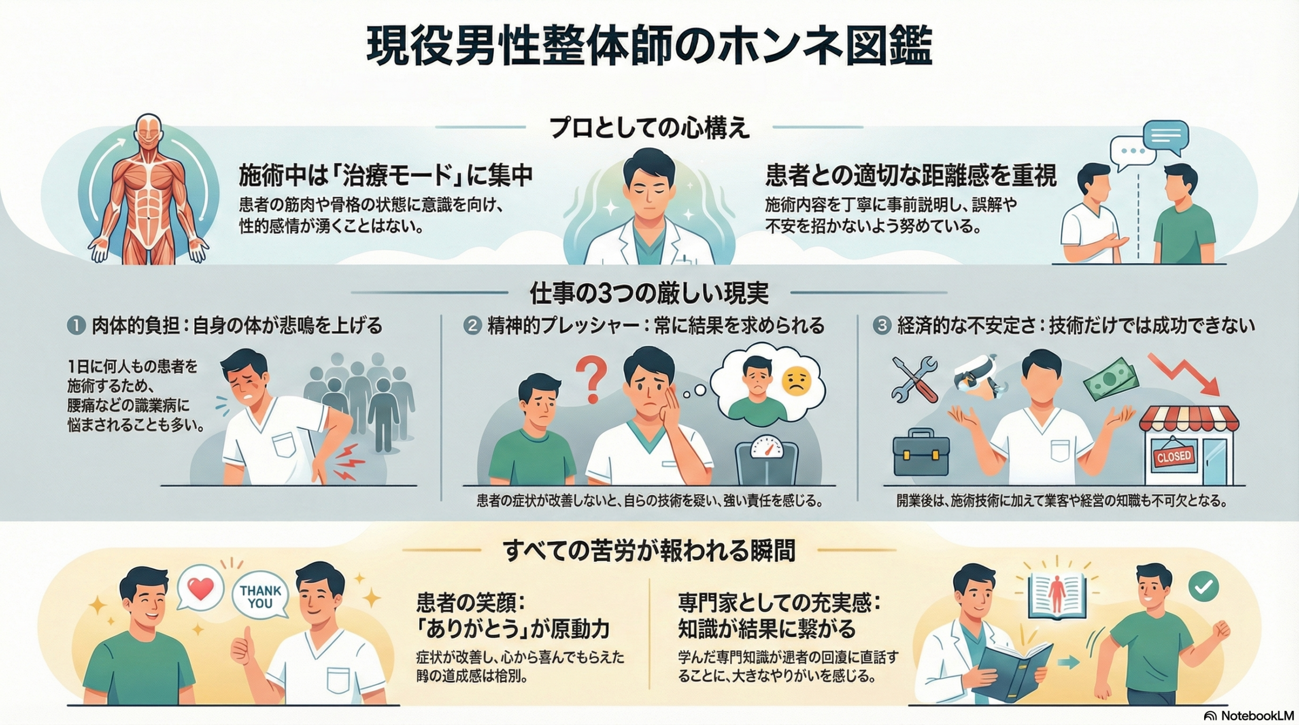 この記事では、現役の男性整体師たちの生の声を集め、職業の実態や患者との関わり方について率直にお伝えします。整体を受ける際の不安解消や、整体師という職業への理解を深めるために、ぜひ参考にしてください。
